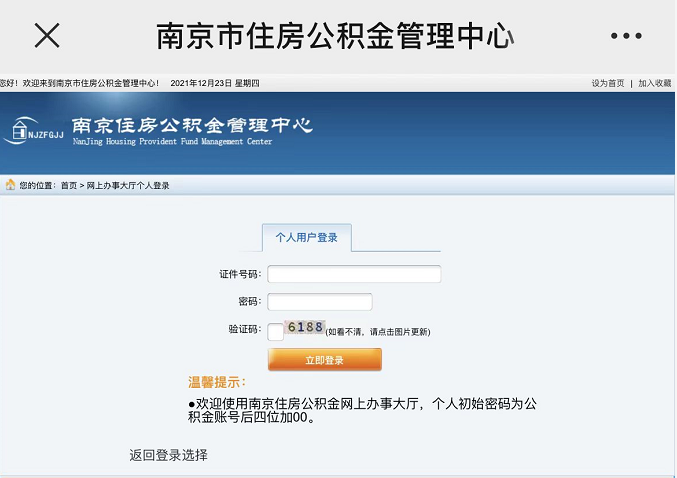 第二步:进入南京住房公积金管理中心,通过身份证号、密码登录查询个人公积金缴纳信息。
