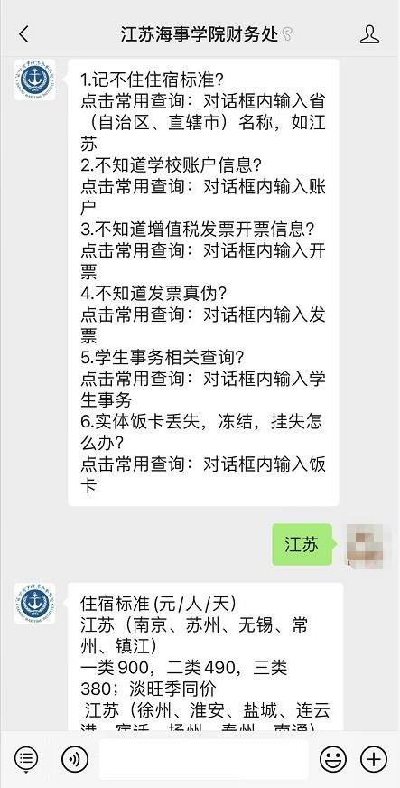 第二步:根据提示,在对话框内输入相应信息,如查询江苏出差住宿费标准,在对话框中输入“江苏”发送,即可查询到江苏省出差各城市住宿标准。