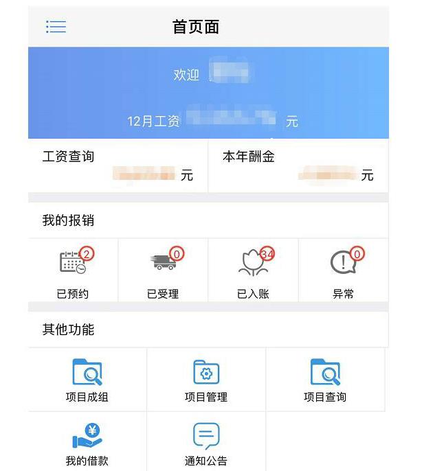 第四步:进入查询首页面后,教师可以根据模块分类查询相关信息。“工资查询”和“本年酬金”模块可以查询到历年发放工资和酬金明细;“我的报销”模块可以查询到已预约、已受理、已入账、异常情况的报销单明细和物流信息;“其他功能”模块可以实现项目查询、借款查询、通知公告等。
