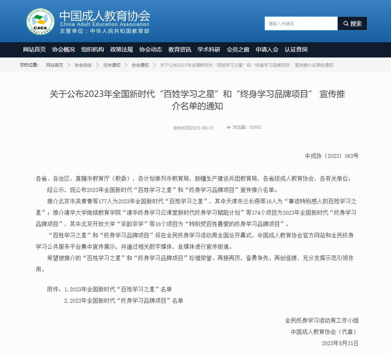 全国新时代“终身学习品牌项目”评选活动是由教育部职业教育与成人教育司主办、中国成人教育协会承办的全国性终身学习活动,旨在倡导终身学习,发挥示范引领作用,为构建服务全民终身学习的教育体系、办好继续教育、加快学习型社会建设服务。