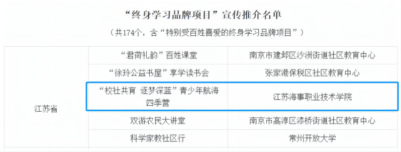 近日,由全国全民终身学习活动周工作小组、中国成人教育协会联合开展评选的2023年度全国新时代“百姓学习之星”和“终身学习品牌项目”揭晓,我校“青少年航海四季营”社区教育项目以优异成绩被江苏省教育厅推荐参加评选并成功获评2023年全国新时代“终身学习品牌项目”(全国174个、江苏省5个单位获此荣誉)。
