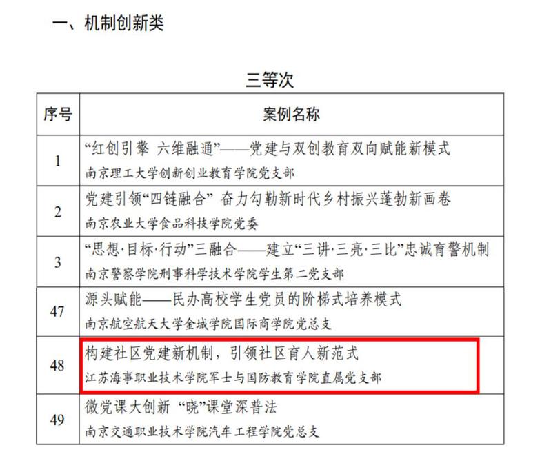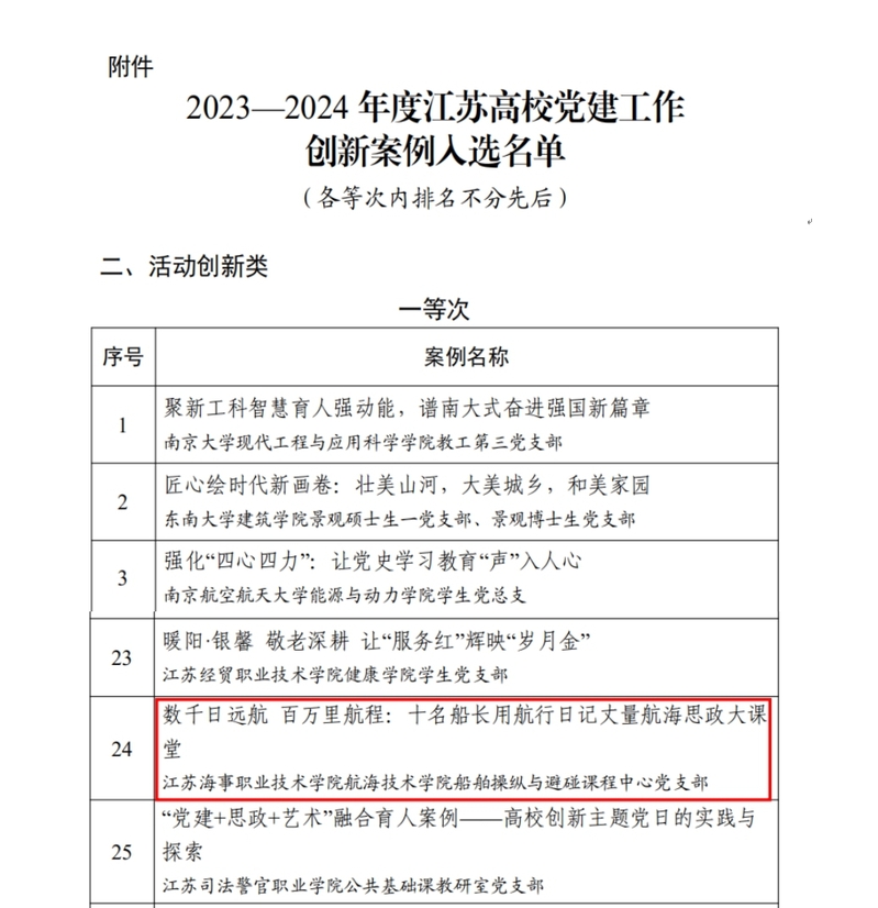 近日,江苏省委教育工委公布了2023-2024年度江苏高校党建工作创新案例评选结果,我校推荐的2项案例全部入选。航海技术学院船舶操纵与避碰课程中心党支部的《数千日远航百万里航程:十名船长用航行日记丈量航海思政大课堂》获活动创新类一等次;军士与国防教育学院直属党支部的《构建社区党建新机制,引领社区育人新范式》获评机制创新类三等次。