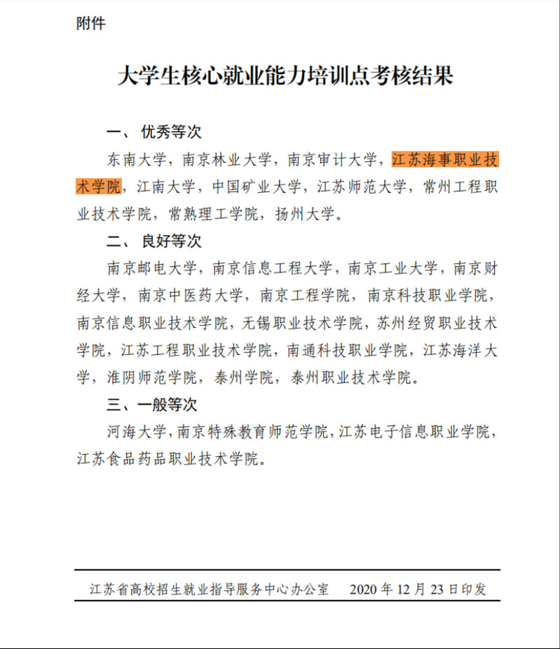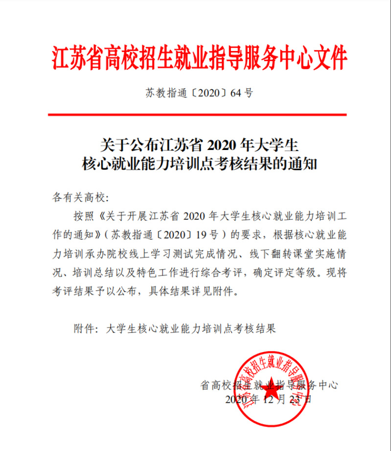 日前,在江苏省招生就业指导服务中心组织的省2020年大学生核心就业能力培训点考核评选活动中,我校获评“优秀等次”,体现了省招生就业指导服务中心对我校就业工作的充分肯定。