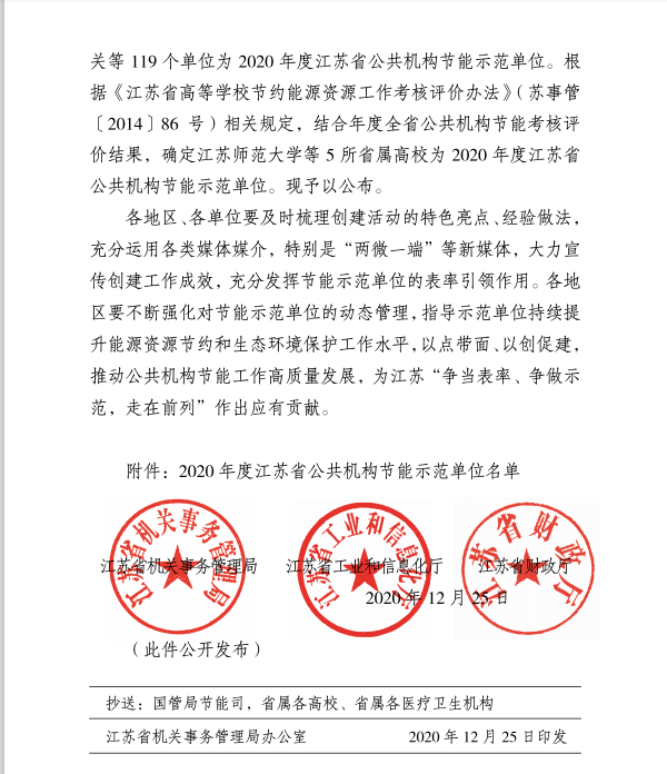 为贯彻落实《江苏省公共机构节约能源资源工作“十三五”规划》,省机关事务管理局、省工信厅、省财政厅等部门联合开展了2019-2020年度公共机构节能示范单位评选工作,经自评自查、相关部门初检、省级有关单位现场抽查、公示等环节,我校最终被确定为“江苏省公共机构节能示范单位”,本次仅有五所省属高校获此荣誉。