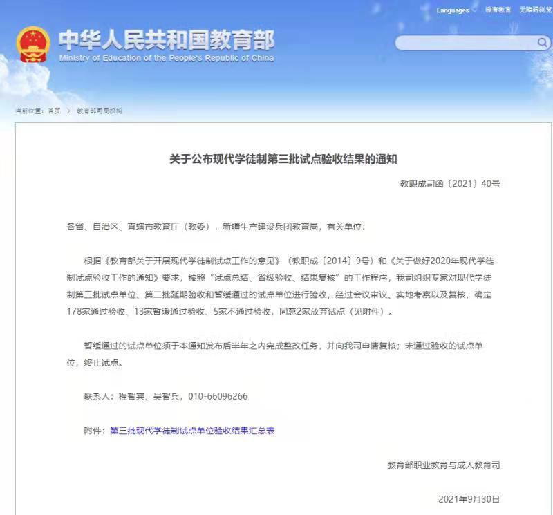 近日,教育部印发《关于公布现代学徒制第三批试点验收结果的通知》(教职成司函〔2021〕40号),我校作为国家级现代学徒制第三批试点顺利通过教育部验收。