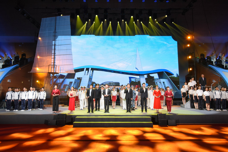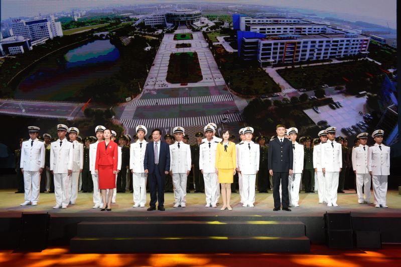 与会领导、师生代表一起登台,共同鸣响学校全面开启高质量发展新航程的汽笛,全场齐声高唱校歌《逐梦深蓝》。
