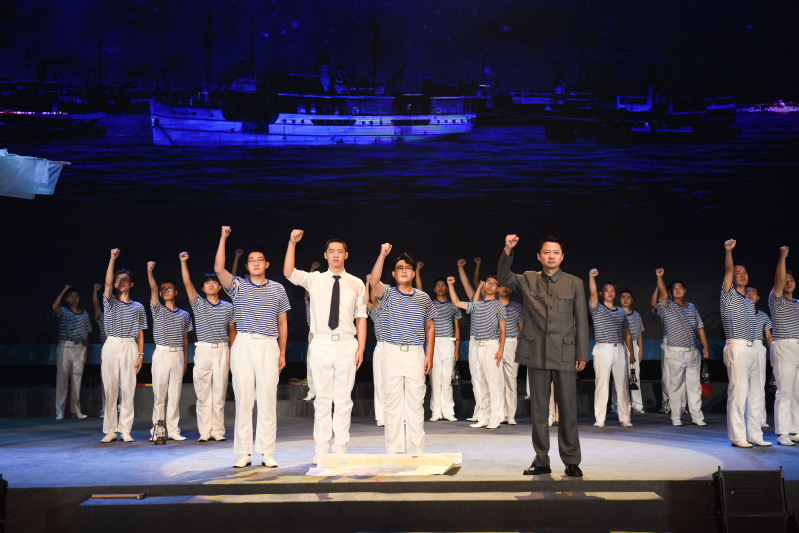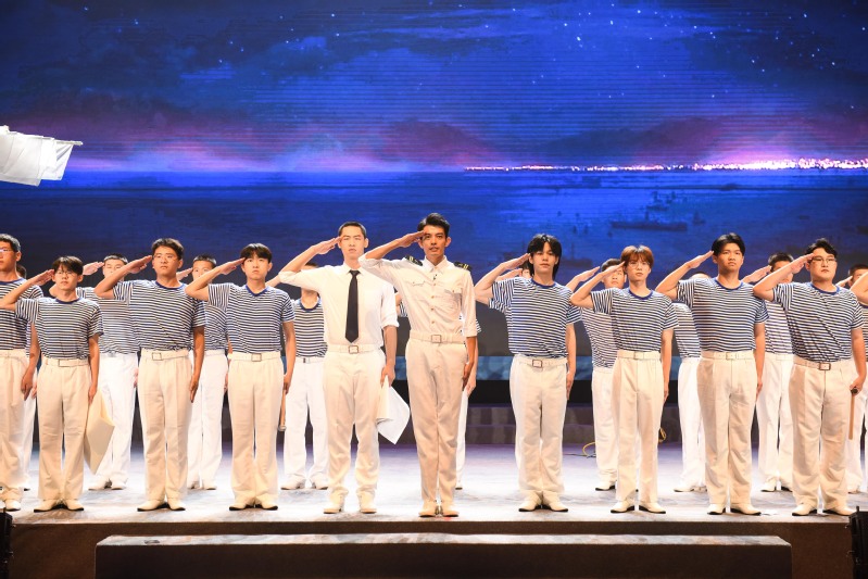 第二阶段,上午9点,由学校和江苏省话剧院联合编排的大型舞台历史剧《远航》以精湛的表演艺术呈现了江苏海院70年勇开先河、奠基立业、追江赶海的壮阔发展历程,“启航·风云激荡开先河”“领航·追江赶海奠基业”“远航·长风破浪向深蓝”三场剧幕,以海校和河校为两条脉络讲述两校渊源、两校建立、两校合并以及2003年合并至今,在不同时代背景下的故事,将校史故事和优秀校友作为主体,展现江苏海院在祖国航运事业的掷地有声和优秀传承,为全体海院人赓续建校之初的红色血脉、传承追江赶海等海院基因提供了鲜活的校史教科书,让206名参演师生和全体观演人员深刻领略前辈们风雨兼程、艰苦创业的历史熏陶,感受红色基因、白色激浪、蓝色未来的澎湃力量。