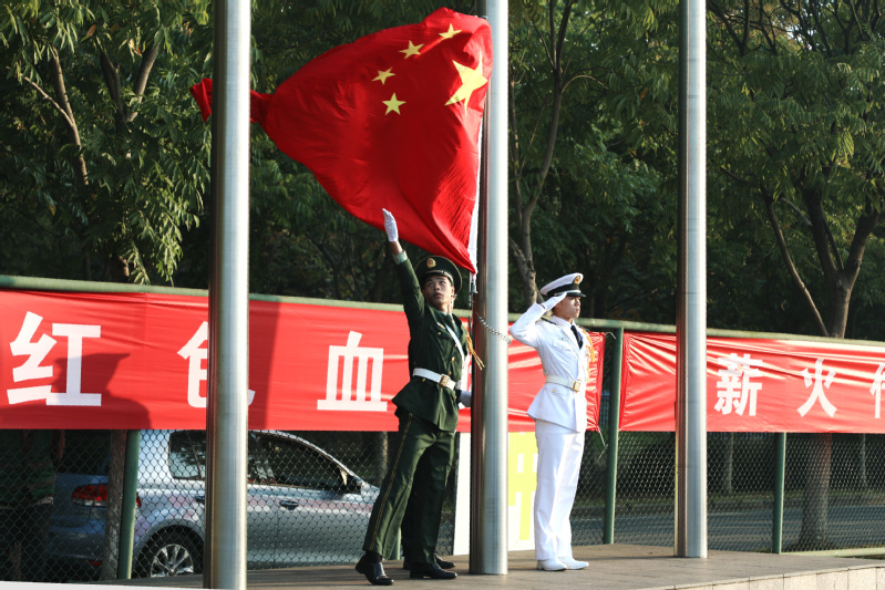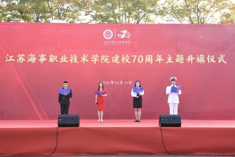第一阶段,清晨7:30分,建校70周年主题升旗仪式在嘹亮的国歌声中拉开序幕,学校全体党委班子成员、老领导、校友代表,全体中层干部、党员,全体新生及老生代表共同参加主题升旗仪式。仪式上,学校党委书记刘红明讲话,他强调70年来,学校始终坚守为祖国“振兴航海、复兴航运”培养优秀人才的初心使命,在追江赶海的不懈奋斗中,奠立了新中国航海职业教育的坚实基业。未来,学校将始终根植于新中国航海事业深深沃土,以更加昂扬的姿态,向着建设国际知名高水平应用型海事类高等院校的宏伟目标奋力迈进。师生代表深情朗诵《我爱海院》,用诗歌吟唱海院学子对母校的祝福。伴着雄壮激昂的《分列式进行曲》,各方队受训新生在主席台前接受检阅,迈着矫健的步伐,伴着嘹亮的口号,他们英姿挺拔,意气风发,充分展现了新一代海院人的热血豪情。分列式结束后,全体师生齐唱《歌唱祖国》。