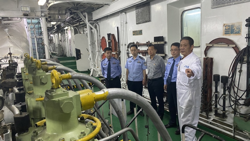 陈国荣一行登上了我校教学实习船“育新”轮,先后来到船舶舱盖、机舱、驾驶台等地参观,随后校警双方在“育新”轮会议室进行了友好的洽谈交流。陈国荣简要介绍了长江航运公安局的机构职能以及南京分局的相关情况,分享了近年来分局和南京森林警察学院开展订单式人才培养的有效成果,并针对公安部在全国公安机关开展全警实战大练兵的要求,提出希望依托我校的专业和人才优势,通过开展校警合作来进一步提升分局青年民警船舶认知水平和水上业务技能的需求。