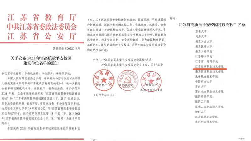 近日,省教育厅、省委政法委、省公安厅联合发布《关于公布2021年省高质量平安校园建设单位名单的通知》(苏教安函〔2022〕8号),我校名列其中,是全省首批荣获2021年“江苏省高质量平安校园建设高校”称号的19所高校之一。