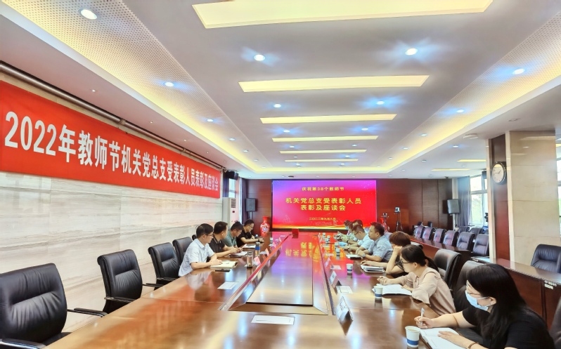 2022年9月8日,机关党总支在办公楼201会议室组织召开第38个教师节机关受表彰人员表彰及座谈会。机关党总支委员及受表彰老师参加会议,会议由机关党总支委员、人事处处长张军主持。