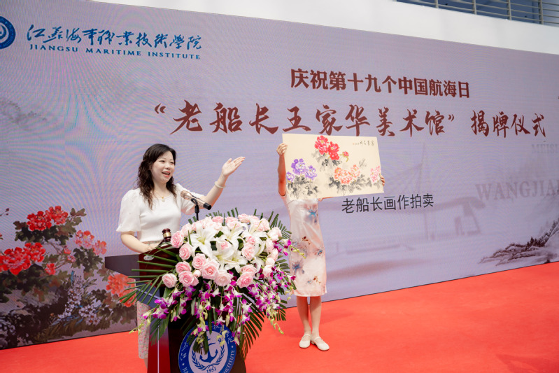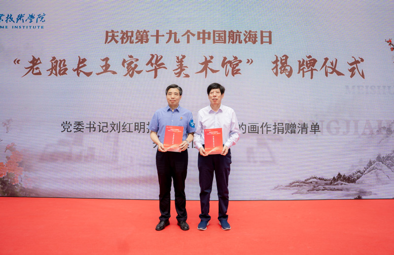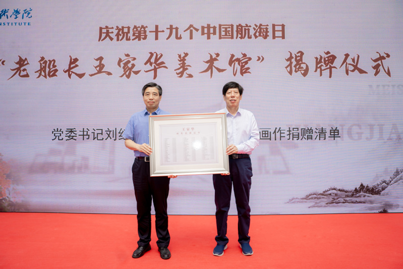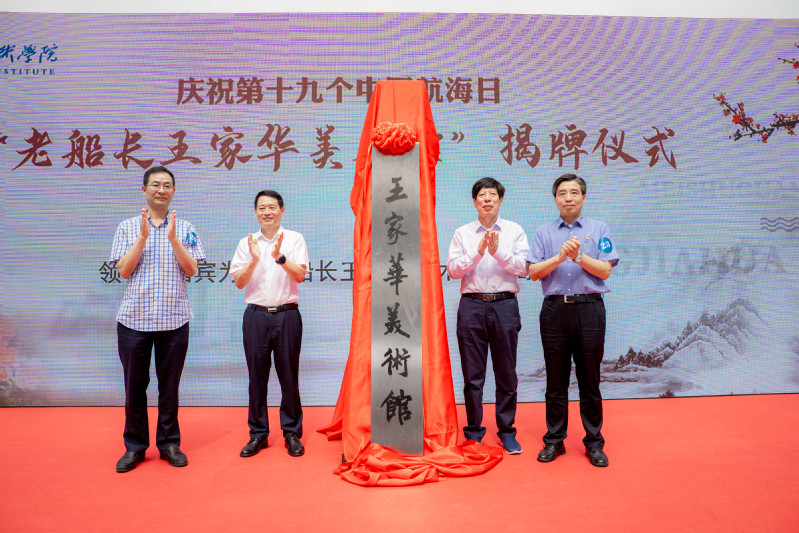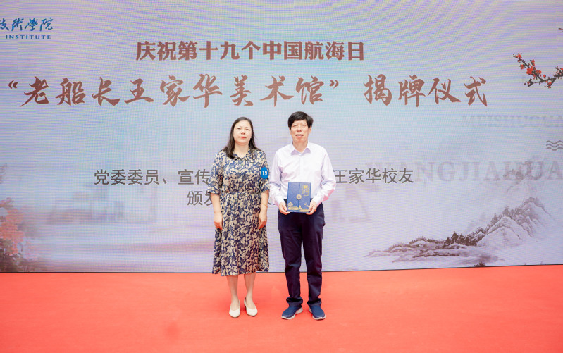 7月11日,在庆祝第19个中国航海日之际,我校举行“老船长王家华美术馆”揭牌仪式。校友王家华及夫人,江苏省中国画学会常务副会长、南京图书馆原党委书记韩显红,江宁区文联党组书记赵冬,江宁区文联科长吴海东,江宁区美协主席杨萍,秘书长周奇峰,副主席胡恒军,江宁区美术家协会副主席诸太宝,理事杨为东以及《光明日报》教育家江苏站主任周洁出席揭牌仪式。我校党委书记刘红明,校长万健,副校长陈晓琴,党委委员、党委宣传部部长刘桂香,党委委员、党委组织部部长孙俭以及相关部门负责人、师生代表以及书画爱好者出席仪式,仪式由校长万健主持。