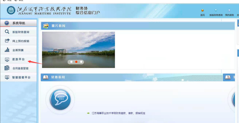 登录校园融合门户,输入用户名和密码——登录后点击应用中心——点击“财务系统”——进入财务系统——点击左侧“差旅平台”。