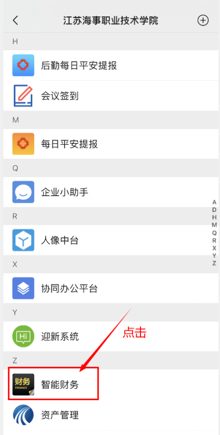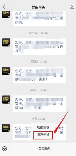 方式一:选择“江苏海事职业技术学院”企业微信,点击“智能财务”—差旅平台,进入差旅平台首页。