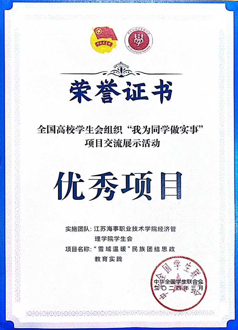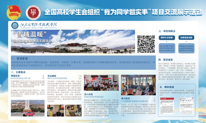 近日,在全国高校学生会组织“我为同学做实事”项目交流展示活动中,我校经济管理学院“雪域温暖”民族团结思政教育实践项目作为江苏省唯一高职院校成功获评全国高校高职(专科)学生会“最受同学欢迎项目”,同时获评全国高校学生会组织“我为同学做实事”项目交流展示活动优秀项目。
