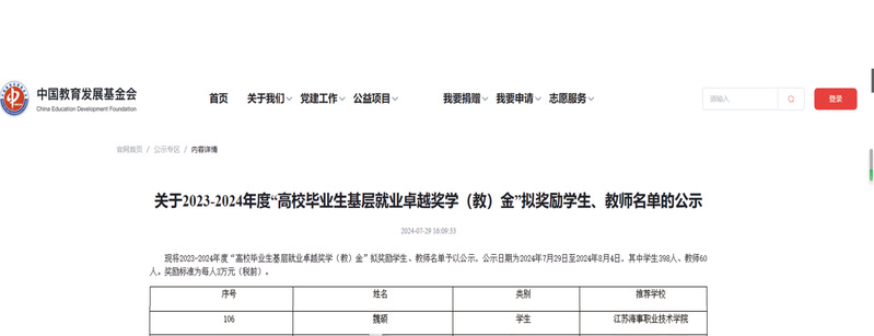 “高校毕业生基层就业卓越奖学(教)金”是由教育部高校学生司(高校毕业生就业服务司)、教育部学生服务与素质发展中心共同指导,中国长江三峡集团出资,奖励赴基层就业并做出突出业绩的普通高校毕业生和普通高校指导服务大学生赴基层就业工作有突出贡献的教师。根据中国教育发展基金会《关于开展2023-2024年度“高校毕业生基层就业卓越奖学(教)金”推荐工作的通知》(教基金〔2024〕15号)精神,经各省(区、市)推荐,全国共遴选优秀指导教师60人,优秀高校毕业生398人,江苏省有3名教师和20名毕业生入选。