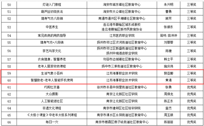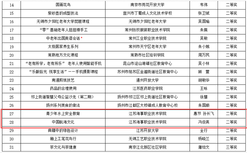 近日,江苏省社会教育服务指导中心组织的优质社区教育视频课程评选结果揭晓,我校选送的6门课程入选江苏省优质社区教育数字化视频课程资源,《青少年水上安全教育》《中国航海文化》等课程分别获得二等奖两项、三等奖两项和优秀奖两项,学校获得优秀组织奖表彰。