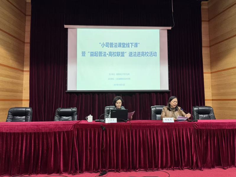 10月23日下午,我校与南京市江宁区司法局联合打造的“小司普法课堂线下课”暨“益起普法・高校联盟”送法进高校活动在图书馆大报告厅成功举办。活动邀请江苏御邦律师事务所执行主任、南京市青少年法治基地特聘讲师刘爱青律师主讲,同步通过江宁发布、直播江宁等平台在线直播,我校300余名师生现场参与,线上观众实时互动。活动由学校党委宣传部部长刘桂香主持。