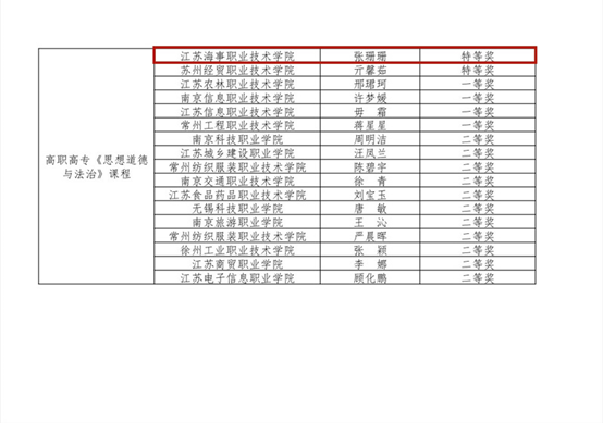 Recently, the Education Department of Jiangsu Province announced the list of winners for the 3rd Provincial College Ideological and Political Education Teaching Exhibition Competition. Zhang Shanshan, a teacher from the School of Marxism at our college, won the special prize with excellent results in the overall score of the higher vocational morality and law group competition, and also advanced to the national competition, achieving a historic breakthrough for our college in this competition!